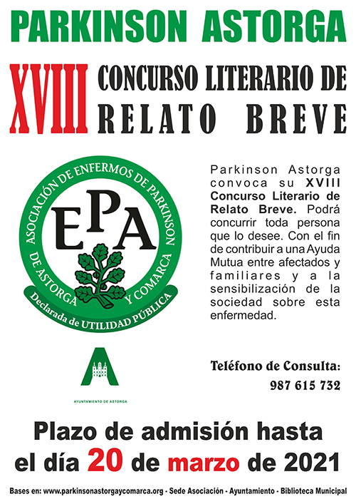 La Asociación «Parkinson Astorga» convoca su XVIII concurso literario de Relato Breve Parkinson Astorga 2021 de acuerdo con las siguientes bases: